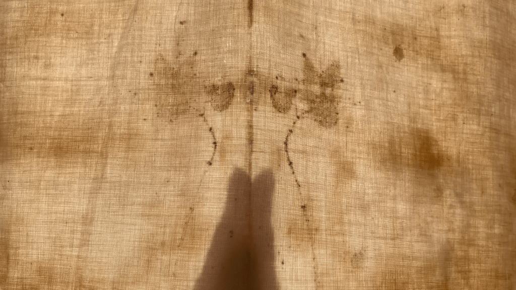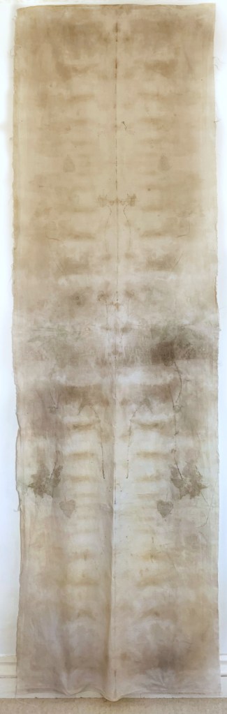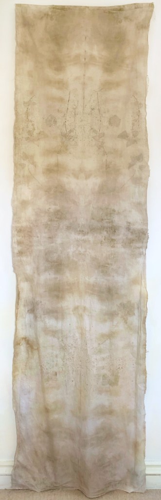 Compost Painting imprints on recycled cotton bed sheet. 63 x 218 cm:
