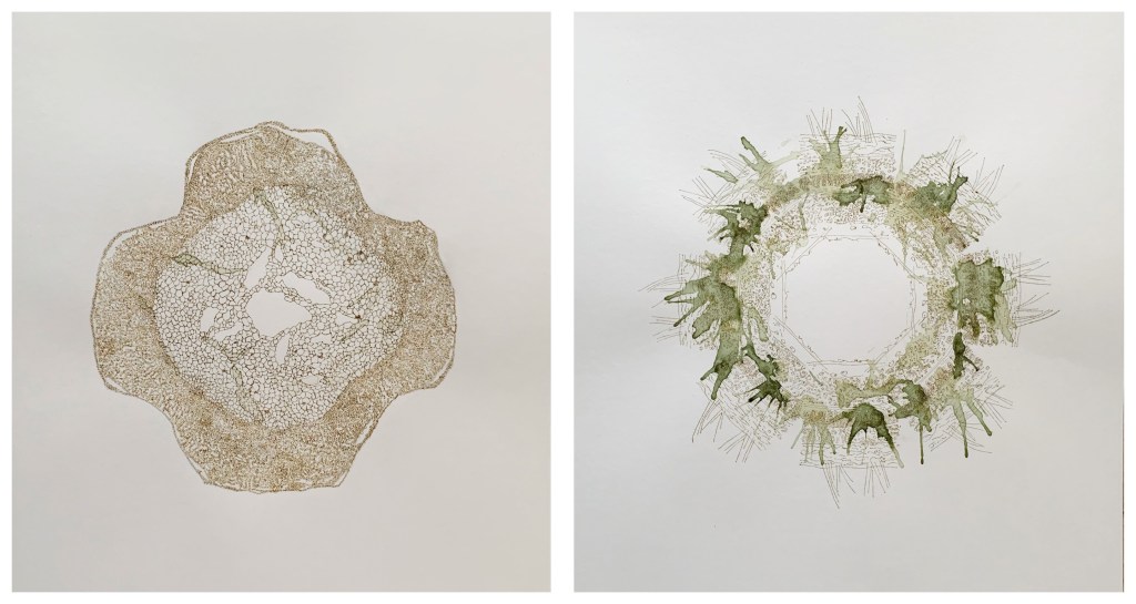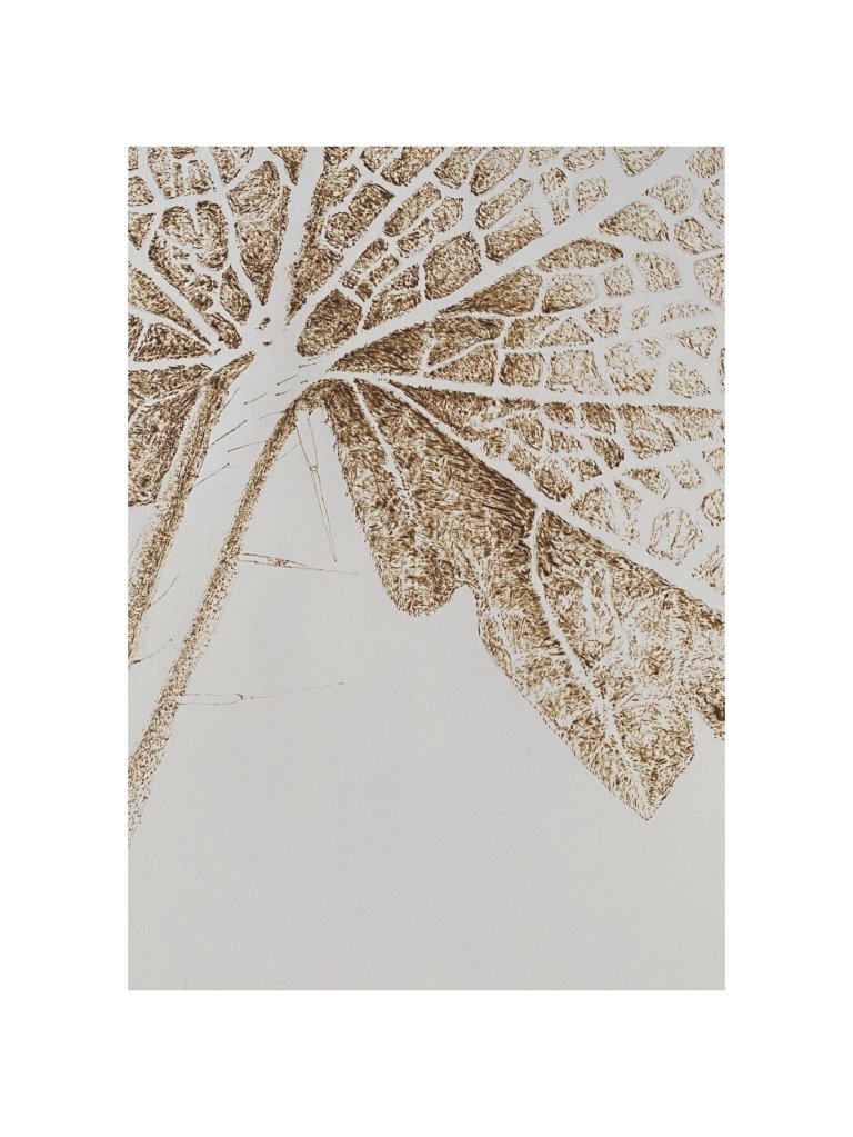 In these works the cellular structures of both human and nettle are referred to and burnt into the paper. Then nettle ink and human breath are blown across the works.
